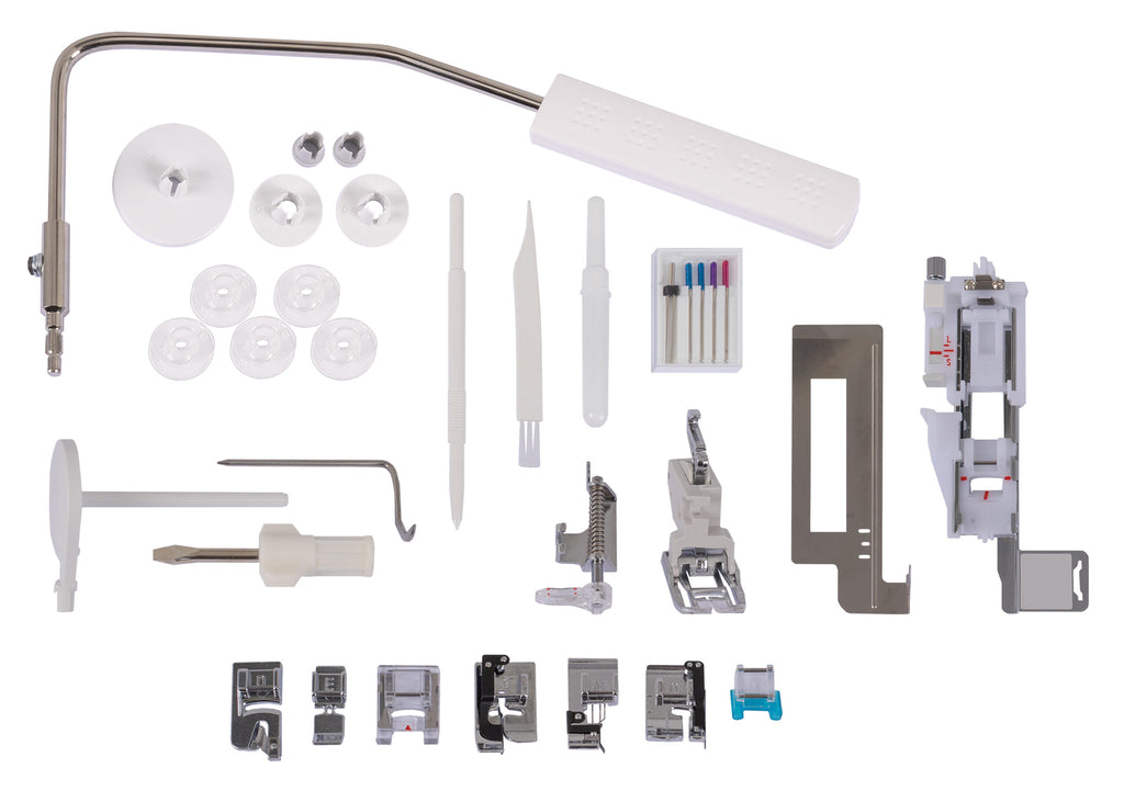 - Compatible with Accessories Listed for: Horizontal Rotary Hook, 9mm stitch width, High shank models, with AcuFeed