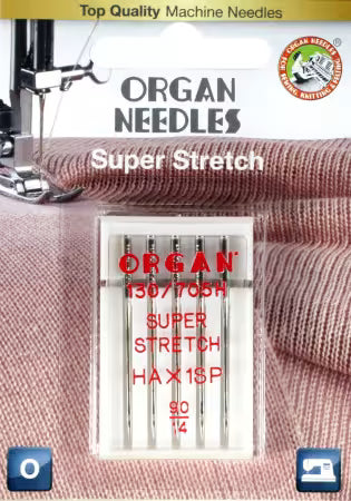 Organ brand Super Stretch ball point needles with special eye for highly elastic materials. Snake head shape alleviates making holes & scarf avoids skipped stitches.
