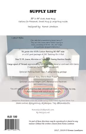 Approximately 30in x 44in area rug made from one Jelly Roll, forty-two 2.5in fabric strips, and 100 percent cotton batting.